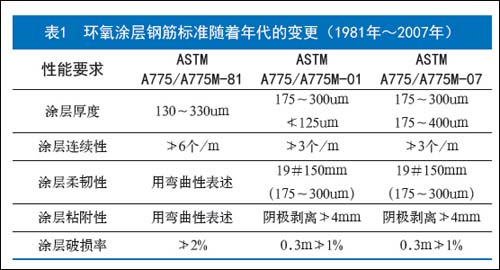普通的环氧涂层钢筋质量和检验标准偏低,如美国ASTM A775/A775M 的标准,发展至今已在破损面积、涂层厚度和漏点控制上有明显改进,但在湿附着力的指标上一直没有提出要求, 是属于普通的标准规范。但缺少控制涂层脱层的关键指标-湿附着力,因此该类钢筋虽然是用环氧粉末进行涂装,实际上的湿附着力偏低。如上述美国Florida 州的大桥发生的早期混凝土破损的现象,由于这类标准的产品没有根本改变耐久性差的问题。