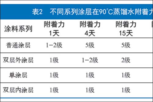 根据上述不同涂层90℃浸泡在蒸馏水中,得出不同湿附着力结果,如表2 所示,表明不同涂层所具有的湿附着力不同,而其有不同的抗涂层脱层能力,双层内涂层>单涂层>外涂层>普通涂层。