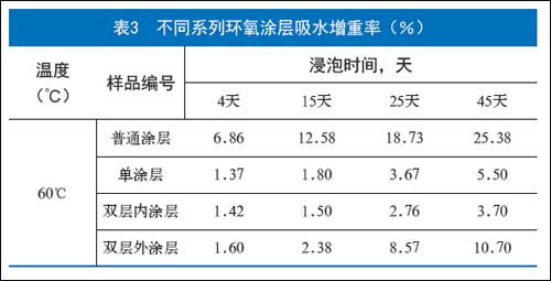 涂层在脱层后,水、O2、和Cl- 在涂层的渗透率直接影响涂层的后续防腐性能,本文也给出了涂层在60℃条件下蒸馏水的吸水增重率变化表征涂层的抗渗透能力,其实也相当于双层内涂层>单涂层>外涂层>普通涂层。为了有效控制涂层的防腐性能, 控制涂层的抗渗透率是一个主要因素。