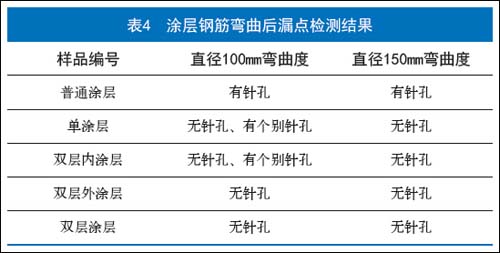 弯曲性能要求是涂层钢筋提出的特殊要求,从表中可见,从这些提出的高性能涂层弯曲性也能达到要求,但是弯曲施工现场是复杂的。表中是实验的结果,为了客观反映现象关于弯曲标准, 还是采用ASTM A775/A775M 中的弯曲标准要求,这是30 年来美国一直延续使用的标准。