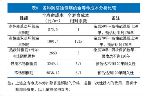 采用不锈钢钢筋事实还存在两个问题:一是经济问题,应用不锈钢钢筋其材料成本要提高6~8 倍,工程费用过高,不合总成本要求;二是技术问题,在已有的不锈钢钢筋的工程中已发现, 不锈钢钢筋与混凝土的粘结强度小于普通钢筋粘结强度,目前这类研究还很少,工程可靠的应用数据还不够充分,依据还不足。