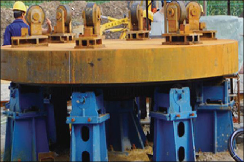 (3)PCCP 管道吊运至旋转平台上方时, 由下方指挥人员指挥行吊操作员放置管道, 要求PCCP 管道均匀的放置在旋转平台上方焊置的接触面上。