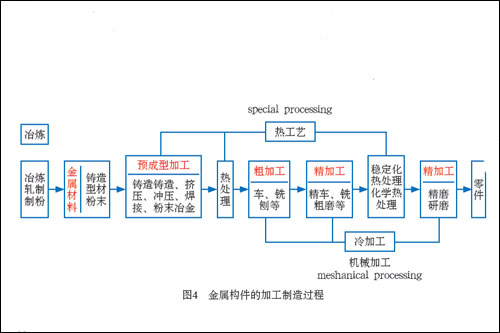 以金属为例,通过消耗能源,将矿石冶炼成为金属和合金(铸件,锻造成为型材,或制成粉末),成为“原材料”;原材料再通过冶炼、铸造、锻造(含挤压。冲压)焊接、热处理成为预成型制品,这个过程在我国称为热工艺加工过程 在国外称为special processing, 因为这个过程不能通过外表测量确定其好坏,只有通过物理冶金、化学分析、力学性能等内在的检测技术,才能检测出是否是合格的加工工艺,所以称为特种工艺;预成型制品基础上的粗加工和精密加工之后,成为精品零件(图4),多个零件组成部件,多个部件组合成为产品。中国已经成为材料大国,支持成为制造大国,维持了中国三十多年GDP 的连续增长。有力地支持了国家的持续发展。