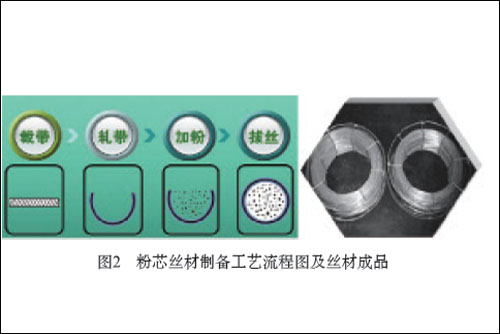调研发现,在Zn-Al 合金涂层中添加少量的Mg 和RE 能进一步提高涂层的耐蚀性能。Mg 的作用是形成尖晶石氧化膜改善涂层中Al 的阴极保护作用,出现“自封闭”现象大大提高了其在盐雾腐蚀环境下的耐“点蚀”性能;RE 元素能细化涂层微观结构,减少喷涂层的孔隙率,并对涂层具有一定的强化作用。但由于受到实心材料拉拔工艺的限制,无法获得高Al(含量大于15% 时)、Mg 含量的喷涂丝材。针对海洋环境下工程设施的长效防腐问题, 创造性地采用粉芯丝材制备技术(如图2 所示),解决了上述技术“瓶颈”,填补了我国在该研究领域的空白。