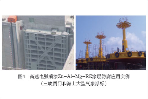 提出了Zn-Al-Mg-RE 涂层的“自封闭”机理。该涂层在腐蚀动态过程中形成了纳米腐蚀产物,随着腐蚀反应的进行,生成了一系列Zn 的碱式盐类、Mg 的氢氧化物及Mg 与Al 形成的尖晶石氧化物的水合物等腐蚀产物(如图3 所示),这些腐蚀产物不但能够在涂层表面形成钝化膜,还能够有效地堵塞涂层中的孔隙, 切断腐蚀介质的快速通道,从而提高涂层的耐蚀性。该涂层耐蚀性能为传统Al 涂层的2-3 倍,有效解决了“点蚀”难题,可使海洋工程设施的防护寿命由原来的3-5 年提高到10-15 年以上,并成功应用到了大型水坝闸门、海洋气象浮标、民用船舶甲板等钢结构件上(应用实例见图4 所示),防护效果显著。