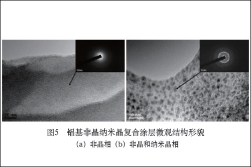 揭示了铝基非晶纳米晶复合涂层微观结构对其防腐、耐磨性能的影响机制。指出涂层中存在非晶具有优异的防腐、耐磨性能的; 弥散分布于非晶中的纳米晶相起到了性能强化作用,使整体涂层具有较高的硬度和良好的耐磨损性能;在腐蚀介质中,纳米晶粒具有较大的比表面能,可促进钝化膜的生成,有利于提高涂层的耐腐蚀性能。非晶与纳米晶相的结合,使得该系列涂层同时具备防腐与耐磨功能。