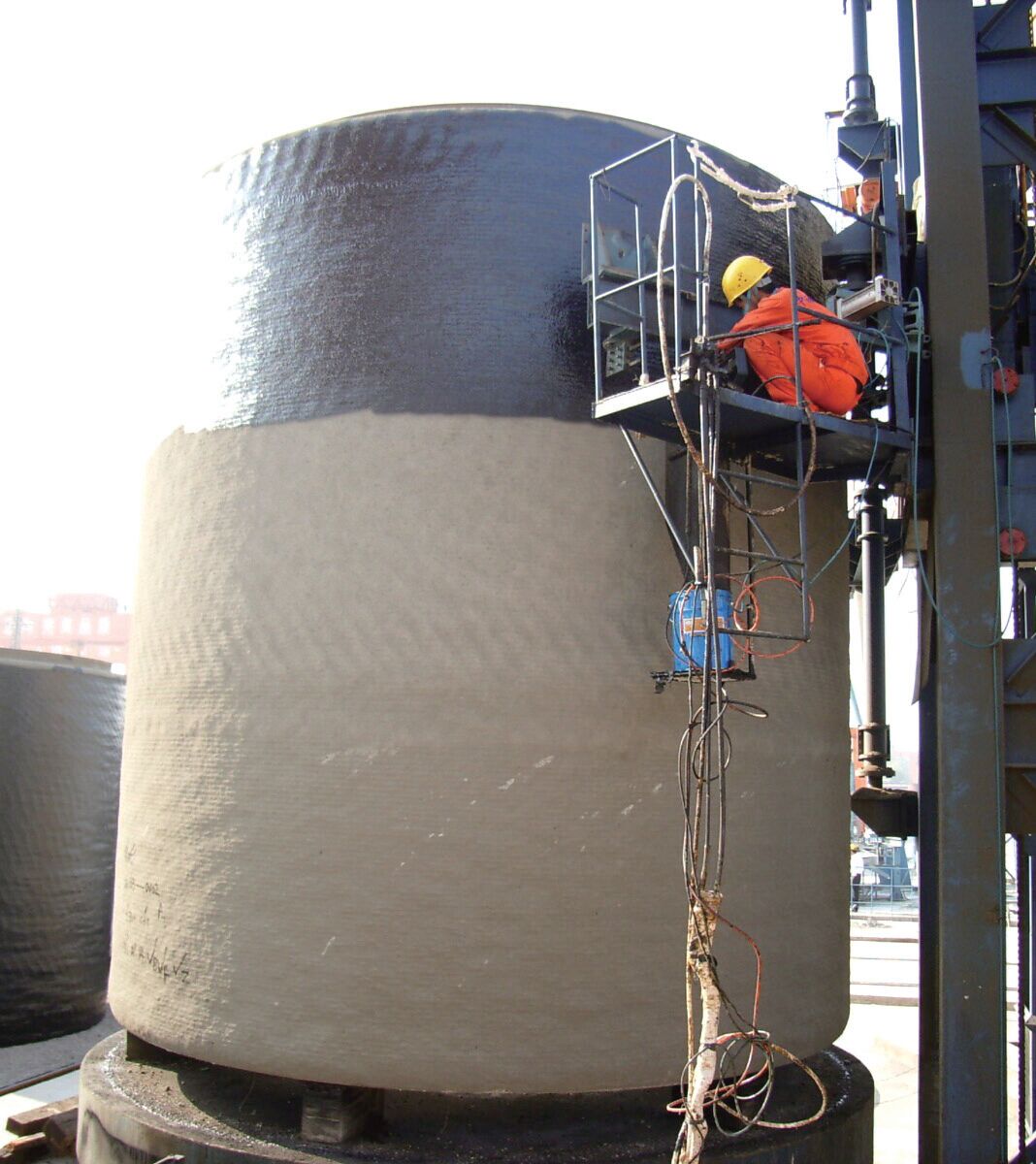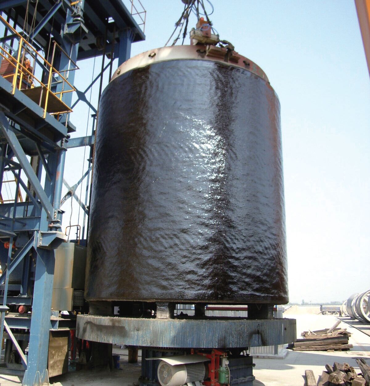 湿喷,顾名思义,就是在水泥砂浆层喷射完成并检查外观无破损后立即进行防腐层喷涂施工,它是一种节省工期的新技术, 其原理是在依靠防腐层把水泥砂浆中的水分封闭,以保证水泥养护过程中所需要的水分,因此,应将防腐层的喷涂完成时间控制在1h 以内,以防止水分蒸发使水泥水化不完全,从而影响PCCP 管道的整体质量。一方面,湿喷工艺要求采用可在潮湿表面固化的防腐涂料品种,一般通过使用可在潮湿表面施工的固化剂,即可保证涂料在混凝土表面潮湿的情况下仍具有良好的粘结及防腐性能。经检测发现,在混凝土砂浆含水率达到7%~9% 的情况下, 涂层与混凝土的附着力仍可达5MPa 以上,可以满足防腐质量的要求。另一方面,湿喷工艺可以利用喷射水泥砂浆的旋转喷浆机, 在喷浆机上安装自动喷枪,利用喷浆机的旋转和升降功能,通过调节旋转和升降速度,使防腐层一次达到设计规定的厚度。整个喷涂流程为:首先将PCCP 管道在旋转装置上按一定速率进行旋转,将自动喷枪升至PCCP 管道顶部,在上升过程中采用压缩空气对PCCP 表面进行吹扫,然后喷枪自PCCP 顶部匀速下降,同时进行喷涂作业,整个喷涂轨迹为螺旋线,喷涂幅宽搭接50%,在喷涂到PCCP 最下部时候,升降装置停止下降,原地喷涂一圈,关闭自动喷枪,整个喷涂时间可控制在25min 之内。对于湿喷工艺, 除需选择可潮湿固化的防腐涂料品种外,由于只能在防腐层实干后方可移动PCCP 管道,为提高工作效率,需在保证涂层质量的前提下,尽量缩短涂层的干燥及固化时间,一般可通过选用快干型涂料或在涂料加热后再喷涂来加以改善。