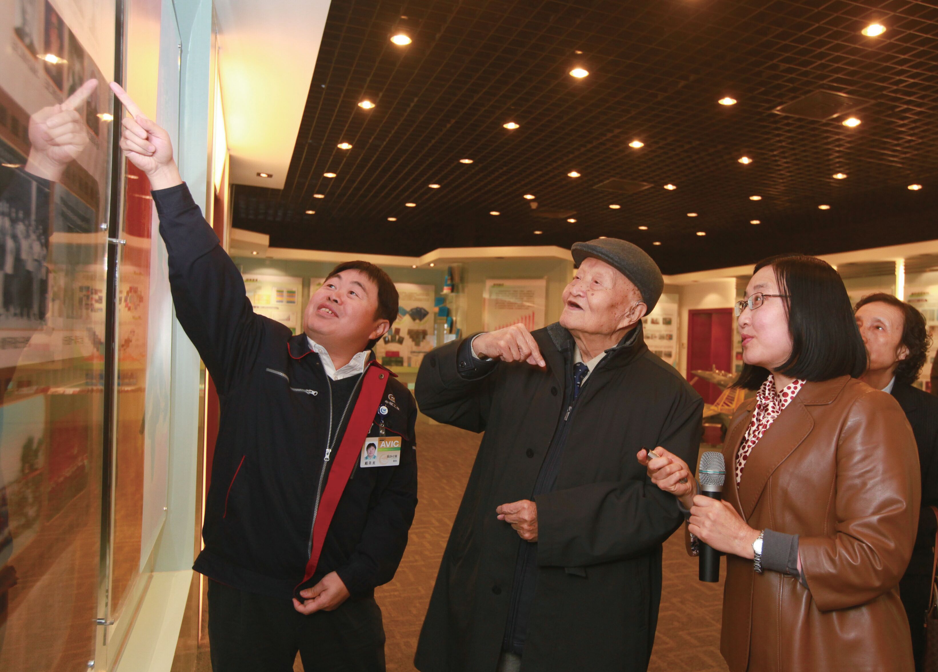 师昌绪在航材院院长戴圣龙、党委书记王亚军的陪同下参观航材院展厅