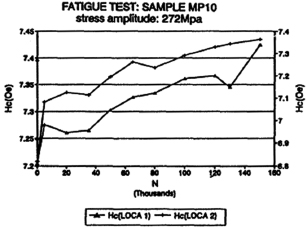 在整个疲劳寿命期间测试材料的磁性能。图3和图4的结果表明:在疲劳寿命早期阶段,作为疲劳软化结果,矫顽力适当降低。然后矫顽力和其他磁滞特性参数在绝大多数疲劳寿命保持稳定。这个稳定区域占寿命的80-90%。最后10-20%的寿命,磁滞参数急剧变化。根据载荷的轮廓,最后阶段对应宏观裂纹形成,伴随一个需要获得一个恒定应变幅的载荷下降。期望主体显微结构在初始疲劳软化之后是稳定的,疲劳中间阶段磁性参数无变化与这一解释一致。