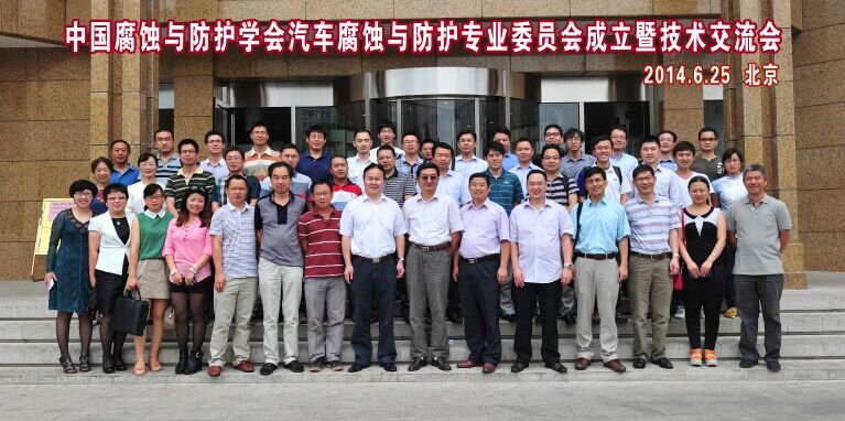 中国腐蚀与防护学会汽车腐蚀与防护专业委员会成立大会于2014年6月25日在北京科技大学举办。来自奇瑞汽车、长城汽车、长安汽车、北汽福田、华晨汽车、北京汽车、江陵汽车、一汽大众、东风日产、比亚迪汽车、江淮汽车、吉利汽车等国内主要汽车制造商的代表,以及来自汽车防腐蚀设备和服务的主流供货商和相关专家学者共50余人参加了成立大会。