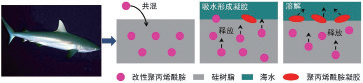 目前,该技术在使用方面已经获得了一定的突破。HEMPEL公司率先推出了基于水凝胶技术的有机硅防污涂料Hempasil X3,凝胶聚合物通过缓慢分离释放,在涂层表面与海水作用形成凝胶,能够大幅提高涂料抗水藻和粘泥污损的性能。中船重工七二五所通过对聚丙烯酰胺进行化学改性,并与有机硅树脂相结合制备了聚丙烯酰胺功能性仿生防污材料[36-38]。该材料在海水的浸泡下,能够在涂层表面形成聚丙烯酰胺微凝胶,随着聚丙烯酰胺微凝胶在水环境介质作用下的不断流失和材料内部聚丙烯酰胺的不断迁移溶出,实现了对鲨鱼表皮粘液分泌行为的模仿(图6)。防污评价结果显示,相对于低表面能有机硅材料,该材料对硅藻附着的抑制率提高了55%,贻贝足丝的附着数量减少了50%以上。