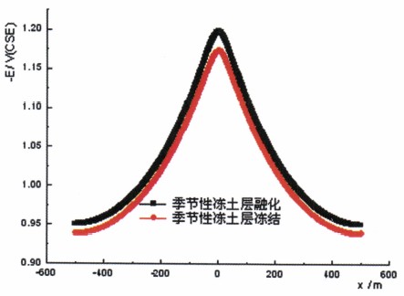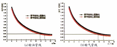 在相同的系统输出情况下,计算得到季节性冻土呈现冻结和融化情况下管道沿线的阴极保护电位分布如图1所示。