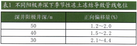 在不同的阳极井深度情况下,当季节性冻土层由融化转为冻结状态时,管道沿线的电位均向正方向偏移,管道的阴极保护程度有所下降,不同阳极井深度下电位正向偏移的程度如表1所示.