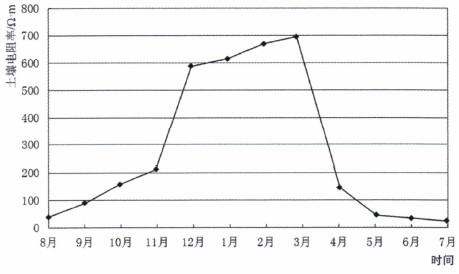 土壤电阻率是阴极保护设计中的一个重要参数,决定了辅助阳极的接地电阻的大小,影响设备的输出和管道的保护电位大小。试验采用SGT-10C型接地电阻在线测试仪,每个月对试验管道周围土壤电阻率进行测试,结果如图4所示。
