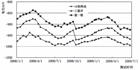 三个位置的阴极保护电位表现出相同的变化规律,最大值均出现在每年3月,最小值出现在每年7月。这与图5所示土壤电阻率随时间变化规律一致。图中三条曲线在2008年10月发生突变,是因为此时为增加保护距离,将恒电位仪(通电点电位值)由-1.42V调至-1.46,使三个测试点管道的阴极保护电位均突然变小。