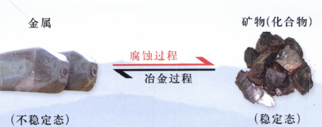 从热力学观点来看,在自然界中,除少数贵金属如金、铂外,绝大多数金属都是以矿物(化学物状态)形式存在。为了获得纯金属,人们需要消耗大量的能量从矿物中去提炼(这就是冶金过程)。因此,提炼出来的纯金属是处于不稳定状态,都自发地与周围介质发生作用进而又变成化合物状态的倾向,即回复到它的自然存在时的稳定状态(矿物)(见图3)。可见,金属腐蚀过程是冶金过程的逆过程,金属发生腐蚀是一种自发倾向。