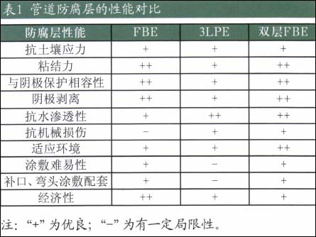 国外针对FBE和3LPE防腐层进行了比较,见表1。