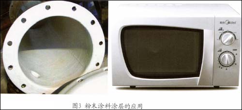 粉末涂料可以采用静电喷涂、流动浸塑、挤压涂敷等多种方法在许多领域得到了广泛应用,包括家电行业、建筑行业、石化行业、管道行业、汽车及其车辆零部件、金属丝网等金属物件、金属家具、电子元器件绝缘涂层及其绝缘包装等(如图3所示)。