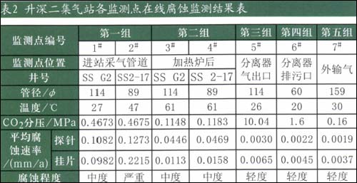 ②升深2-1区块升深二集气站。在升深二集气站所辖气井的井口处至外输集气干线之间不同的压力、温度、流态区间,分别设置了7个监测点。对站内相同流态区间、不同生产运行条件下的管道分别在线实时腐蚀监测比对。监测点的设置和监测结果见表2。