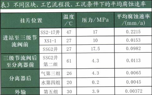 以升深更2、升深2-17及徐深1-1井的采气、集输工艺管段为例,各个测试点处于不同区块的不同工艺流程段,工况条件也不同。根据挂片的质量损失计算出试验周期内的平均腐蚀速率见表3。