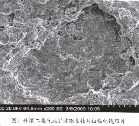 升深二集气站第一组1#监测点取回的挂片进行扫描电镜观察。基体表面有产物膜生成,呈块状,块状产物连接成层片,不致密。一旦产物膜破损,会进一步腐蚀,将形成坑蚀,如图1所示。