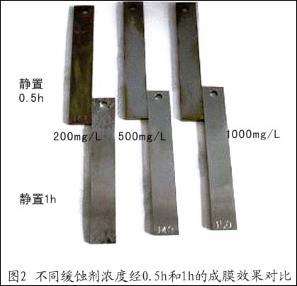 ③蚀剂成膜试验。取现场升深2-17井采出水,加入不同浓度的缓蚀剂,并放入处理好的新试片。试片放置一定时间后,往溶液中加入1%的硫酸铜溶液,10s后取出挂片用清水冲洗。根据挂片表面被Cu置换的面积来判断成膜效果,表面被置换面积越少,说明缓蚀剂吸附膜越完整,如图2所示。