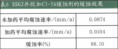 在SSG2、SS2-17及SS2-21井进行投加缓蚀剂试验,SSG2井腐蚀最轻,采用预膜间歇加药方式,随后开始间歇加药,每日加药量为40kg,实加纯药浓度为13mg/百标准立方气,监测得缓蚀率88.10%见表6。
