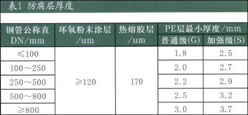 ①防腐层厚度。按照防腐的要求,3PE/2PE外防腐层厚度指标见表1。对于2PE的防腐层,没有环氧涂层;焊缝部位的涂层厚度不低于表中规定值的70%。