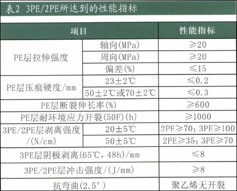 ②防腐层其他指标。按照防腐的要求,3PE/2PE外防腐层的其他指标要达到表2中的要求。