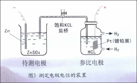 值得注意的是,这种单电极的电位,荷电的一方为金属侧,另一方为溶液侧,故其绝对电极电位值是无法直接测得的。因此,实际测量某金属的电极电位(如Zn电极)时,必须另找一个具有恒定电位值的单电极系统(如氢电极系统)作为基准(参比电极)与之组成原电池(图3),测出原电池的电动势从而获得待测电极(Zn电极)相对于氢电极参比电极的电极电位。今后用E表示的均为相对电极电位。