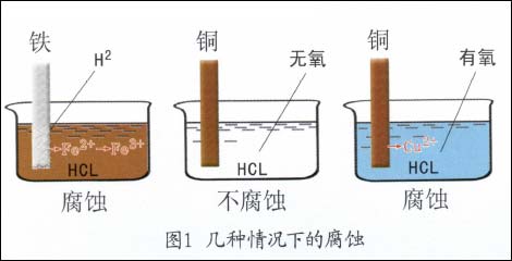 金属电化学腐蚀过程是金属和它周围的电解质环境所组成的体系,从一个热力学不稳定状态过渡到热力学稳定状态的过程,其结果是生成各种化合物,同时引起了金属结构的破坏。例如:把铁片浸入盐酸溶液中,立即可见有氢气放出,同时铁会以相同于氢放出的速度而溶解到溶液中,即铁发生了腐蚀。又如把紫铜片放入不含溶解氧的盐酸溶液中时,却见不到有氢气放出,铜片也不发生溶解而腐蚀溶液。但是盐酸中一旦有氧溶解进去后,就能见到紫铜片不断遭受着腐蚀。此时仍然看不到有氢气放出,如图1所示。