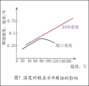 溶液温度升高,将使氧的扩散过程和反应速度加快,使腐蚀速度增大。另外,随温度升高,氧的溶解度降低,腐蚀速度随之减弱。因此在敞口系统中,二种相反因素作用,使腐蚀有一个最大值。如图7所示。