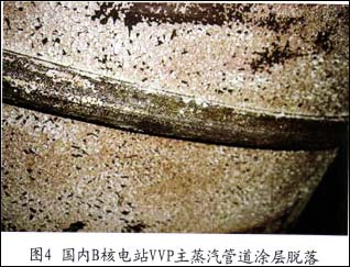 2005年10月,对国内B电站VVP主蒸汽系统管道进行了腐蚀检查,发现VVP系统主蒸汽管线跨越NX核岛厂房和MX汽机厂房的三根主蒸汽管道,在拆除保温后其表面涂层呈粉状,且脱落严重,对管道的保护效果已经很小,见图4。
