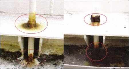 从以上两个案例可以看出,腐蚀主要发生在她脚螺栓与混凝土地面和加强板交界面处,腐蚀的主要模式为缝隙腐蚀。地脚螺栓安装时,螺杆和螺栓孔之间存在缝隙且未采取密封措施,导致腐蚀性介质在该处聚集,引起腐蚀;地脚螺栓与混凝土地面结合处没有采取排水措施,雨水等腐蚀性介质进入后很难自行排出,大气中的盐分、固体颗粒等沉积在此处,增加了电导和腐蚀性,导致螺杆发生腐蚀。