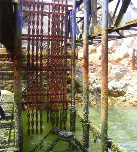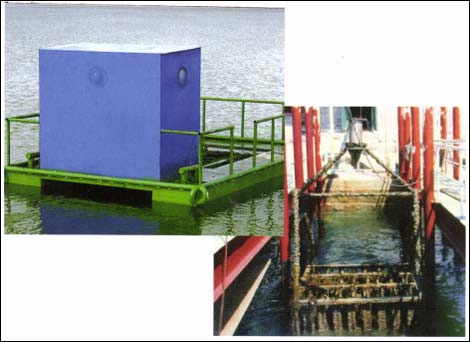 图3 水环境全浸腐蚀试验装置:浮船(左)和提出水面的固定式试验架(右)