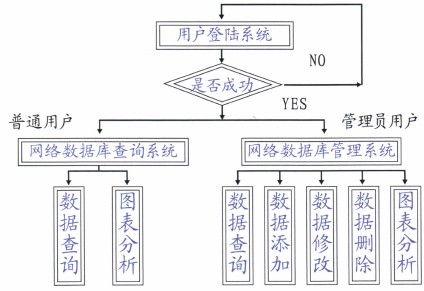 通过网络数据库管理、查询系统,能够实现对材料环境腐蚀网络数据库的管理和查询,达到腐蚀数据共享的目的。从数据库数据的查询、管理和安全性考虑,可以把用户分为普通用户和管理员用户。数据库共享系统功能整体框架如图3所示。