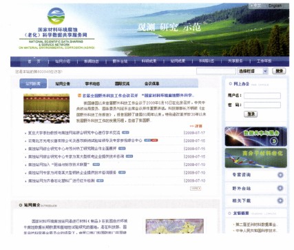 在上述工作的基础上,共享网站完成了网页编程设计工作,开发了上传信息管理统计系统,用户日常管理分析系统,实现网上用户及权限管理,2005年年底“国家材料环境腐蚀(老化)科学数据共享服务网”的web网站(中/英文双语)开通对外提供服务(图4),为网上数据库查询、信息发表、资源共享提供便利途径。实现了材料环境腐蚀网上资源、数据共享;实现了一个安全性高,扩展性好且适用于互联网的新一代智能化的、协作各种应用的“国家材料环境腐蚀(老化)科学数据共享服务平台。其建立也标志着材料环境腐蚀网站数据共享体系的初步形成,这是目前我国材料腐蚀领域种类最全,数据量最大的共享数据库。