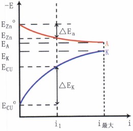 图中ECu°和EZn°分别为铜电极和锌电极的开路电位。随着电流密度的增加,阳极电位沿曲线EZn° A向正方向移动,而阴极电位沿曲线ECu°K向负方向移动。把表示电极电位与极化电流密度之间的关系曲线称为极化曲线。图5中EZn° A为阳极极化曲线;而ECu° K为阴极极化曲线。ΔEa和ΔEk分别是在电流密度为i1时的阳极极化值和阴极极化值。