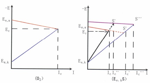 碳钢在海水中的腐蚀属于此类情况。流动能促进O2去极化剂的还原反应,故阴极极化曲线Ee,kS′比Ee,kS平坦,从而导致腐蚀速度明显加大(Ic′>Ic),所以流动海水中的腐蚀要比静态中的严重得多。