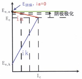所谓阴极保护,不管是用牺牲阳极还是外加电流法来实现,其实质就是将被保护设备变成“阴极”,使之阴极极化以达到控制腐蚀的目的。由于阴极电流的通过,被保护设备的电位从腐蚀电位EC开始负移,腐蚀阳极反应的电流ia随之减小,腐蚀减小。当电位移到阳极反应的起始电位Ee,a时,ia=0,腐蚀停止。阴极保护效率达100%。理论上这就是最小阴极保护电位E阴保