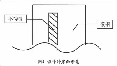 这样做,在埋入面与外露面的交界处,即不锈钢与碳钢的焊接处,不仅发生缝隙腐蚀和电偶腐蚀,且此处无保护层,又处于大阴极小阳极状态,其腐蚀的速度会很快。后果是外露面会过早的脱落,这种设计是错误的。