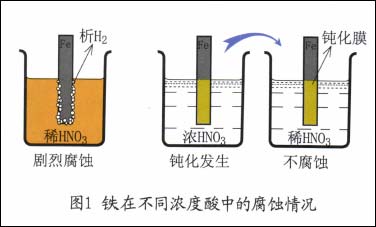 金属钝化这一奇妙现象早在17世纪末就被美国学者KEIR发现。他把铁放在稀硝酸中时,铁的腐蚀非常剧烈。但当他把铁先放入浓硝酸中浸渍后,再放入稀硝酸中,铁不再受到腐蚀。如图1所示。