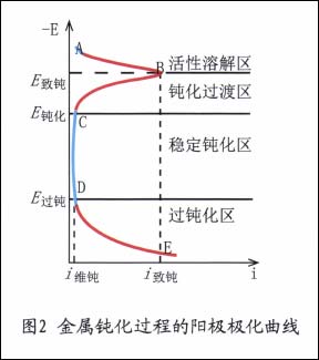 钝化的发生是金属阳极过程中的一种特殊现象,描述钝化过程典型的阳极极化曲线如图2所示。