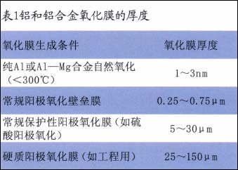各种铝和铝合金氧化膜的厚度见表1。