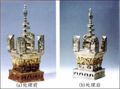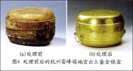 利用该缓蚀剂方法保护处理了重要银器文物约一千六百余件(枚),其中包括2001年我国十大考古新发现之一的杭州雷峰塔地宫出土的藏有“佛螺髻发”的纯银阿育王塔和鎏金银盒等珍贵文物。如图4、5所示。