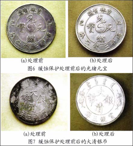 经复合配方缓蚀剂保护处理的各类银器文物在馆藏库房条件下未发现进一步腐蚀现象,综合保护处理效果较理想。