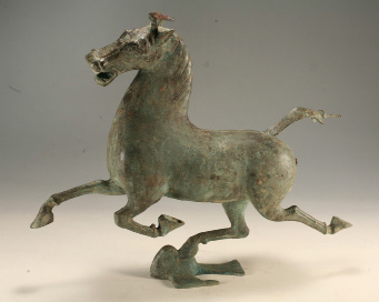 铜奔马又名马踏飞燕,为东汉青铜器,1969年在甘肃武威擂台出土。铜奔马体态矫健、昂首飞奔是汉代天马的典型形象。铜奔马构思巧妙而科学,三足腾空,右后足踏在龙雀(古代风神)的背上,寓意神速,是一件完美的艺术杰作。1983年铜奔马被确定为中国旅行社的标志,原文物现藏甘肃省博物馆,被视为甘肃省博物馆的镇馆之宝。此件仿制品是根据原文物以1:1的比例仿制的。