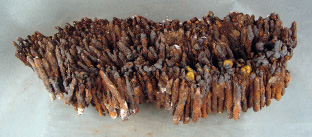铁质文物在潮湿空气中会迅速生锈,在铁质文物外表形成一层褐色的氢氧化铁,在氧存在的条件下,形成三种不同构相的同分异构体--α-FeOOH、β-FeOOH、γ-FeOOH。其中γ-FeOOH由于其疏松形态及毛细管作用,可使含有一定氧的水分子深入铁质文物内部,不仅使铁质文物发生化学腐蚀,而且会发生速度更快的电化学腐蚀,腐蚀的产物仍是疏松吸水物质,所以腐蚀周而复始可以不断进行,铁锈的厚度也不断增加。