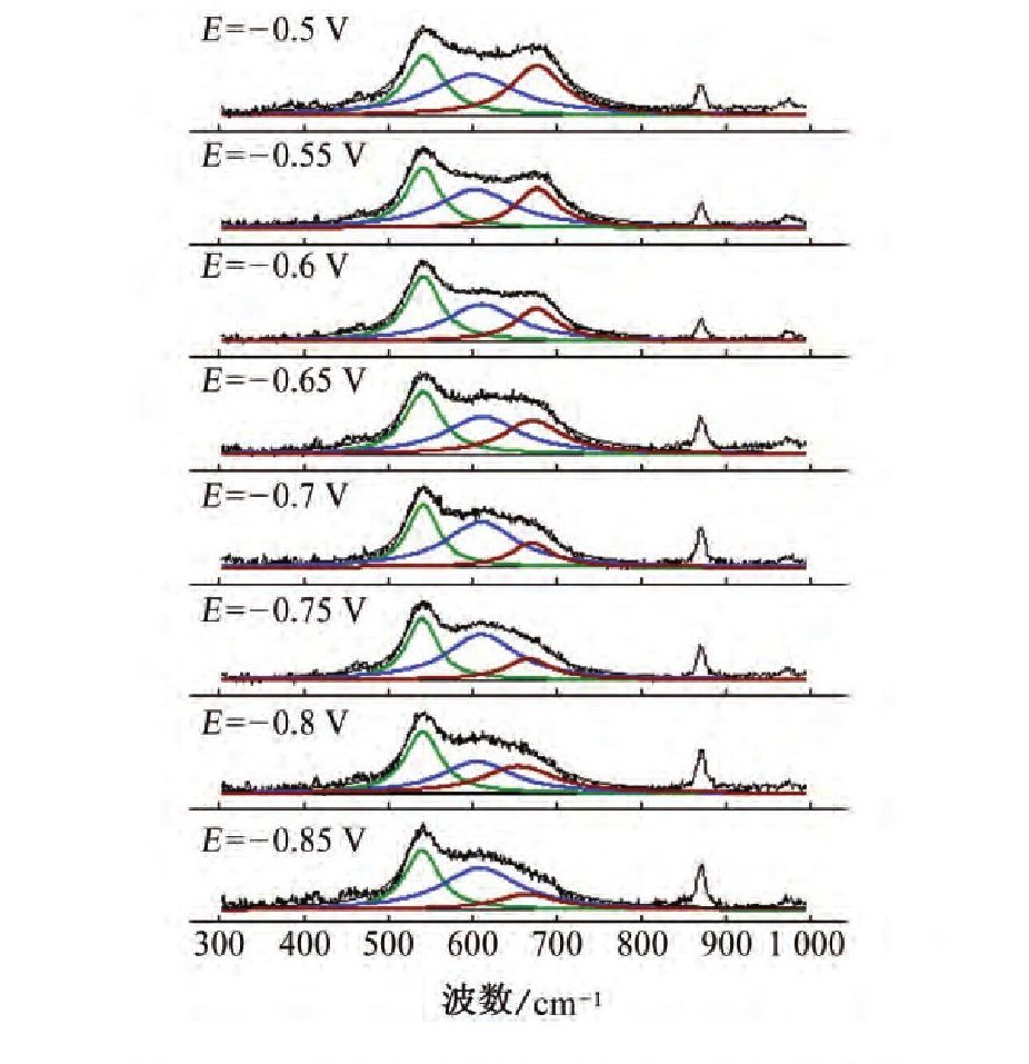 (3)600合金腐蚀氧化膜的原位拉曼光谱存在3个峰,其中540,610cm-1峰来自Cr2O3氧化膜,670cm-1峰来自FeCr2O4尖晶石产物。当样品极化电位从-0.85V增大到-0.5V时,670cm-1的相对强度显著增强,说明腐蚀氧化膜中尖晶石的相对含量发生了变化。