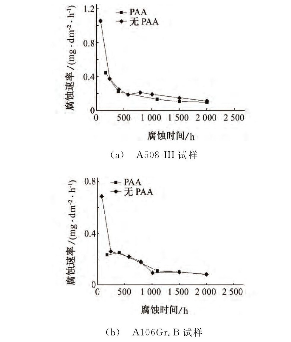 由图3(b)可见,在无PAA条件下,随着腐蚀时间的延长,A106Gr.B试样的腐蚀速率先快速减小,随后逐渐变缓趋于稳定。在ETA溶液中添加PAA后,试样腐蚀速率逐渐随时间的变化规律与未添加PAA时的基本一致,但腐蚀速率有所减小。根据腐蚀失重试验结果,经2 000h腐蚀试验后,试样在未添加和添加PAA的ETA溶液中的腐蚀失重分别为164.29mg/dm2和168.18mg/dm2,腐蚀速率分别为0.084mg/(dm2·h)和0.082mg/(dm2·h),约降低8%,可以认为PAA与A106Gr.B材料具有较好的相容性。